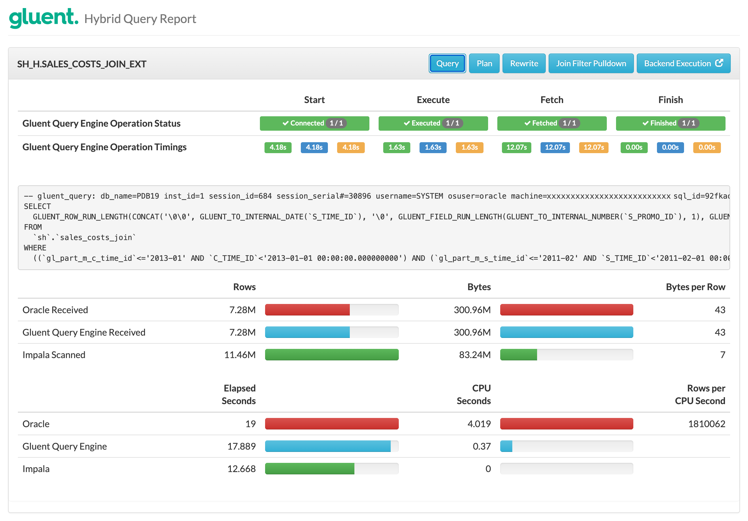 This section shows both elapsed and CPU seconds consumed by the backend engine, Gluent Query Engine and Oracle Database for the external table plan line. The Rows per CPU Second metric is a good indicator of the row ingestion performance.
