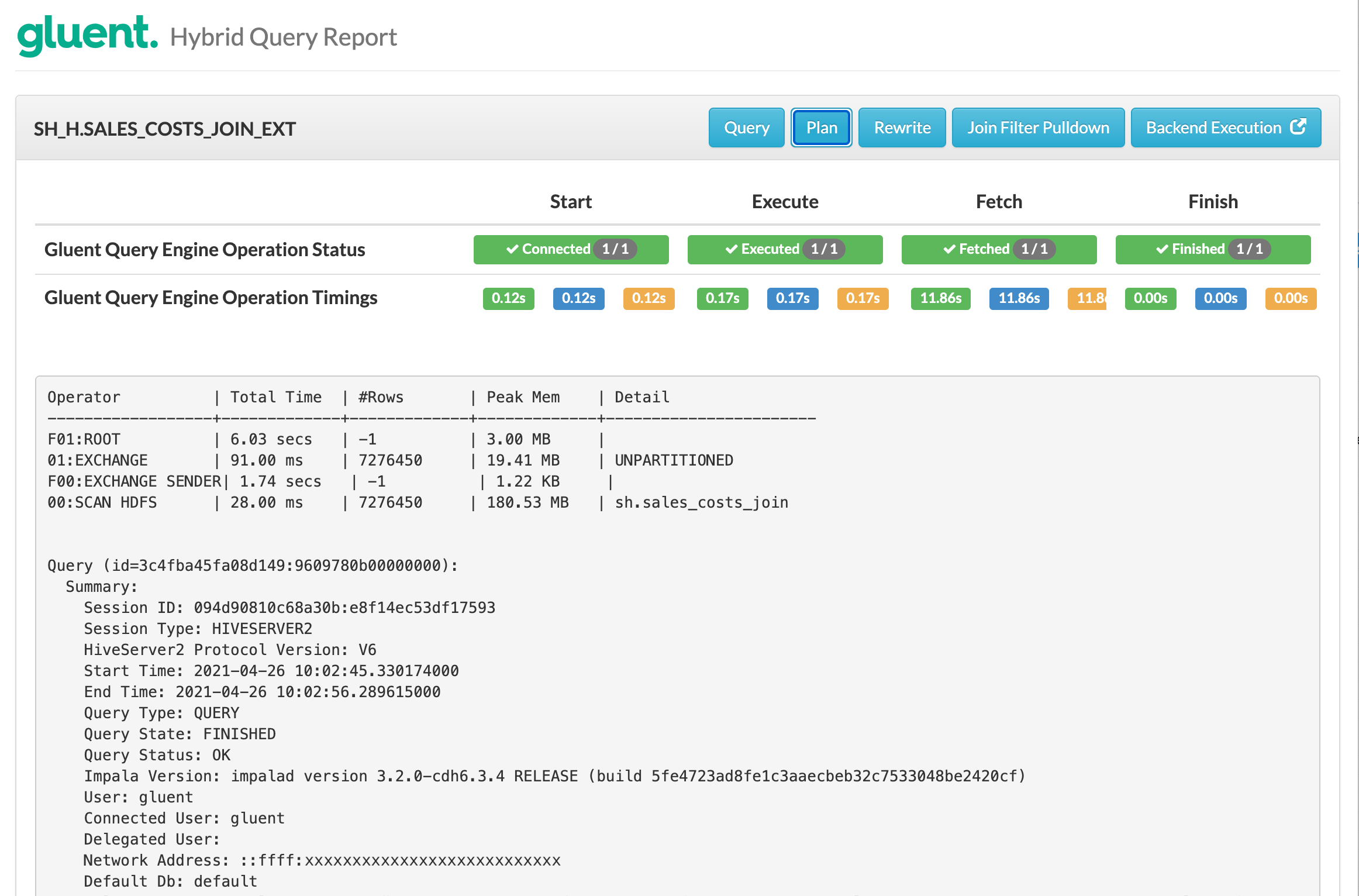 Gluent Data Platform’s hybrid query profile shows Gluent Query Engine/backend resource consumption: